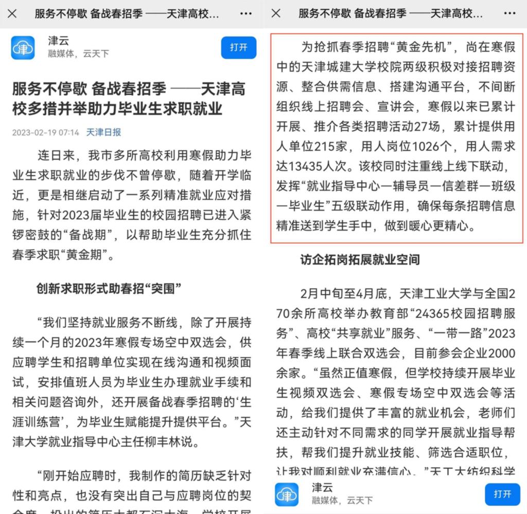 2月19日,《天津日报》、津云客户端以《服务不停歇备战春招季》为题报道了我市多所高校多措并举助力毕业生求职就业的典型案例。其中,对365英国寒假暖心就业服务不断线工作进行报道。具体如下: