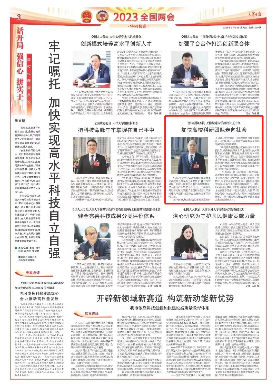 今年全国两会上,来自天津高校的代表委员表示,要牢记总书记的殷殷嘱托,自觉履行高水平科技自立自强的使命担当,加强推进“产才学研”深度融合,在实践中发现和培养拔尖创新人才。发挥学科综合优势和人才集聚优势,围绕国家重点领域、重点产业,努力突破关键核心技术难题,为推动天津高质量发展贡献力量。
