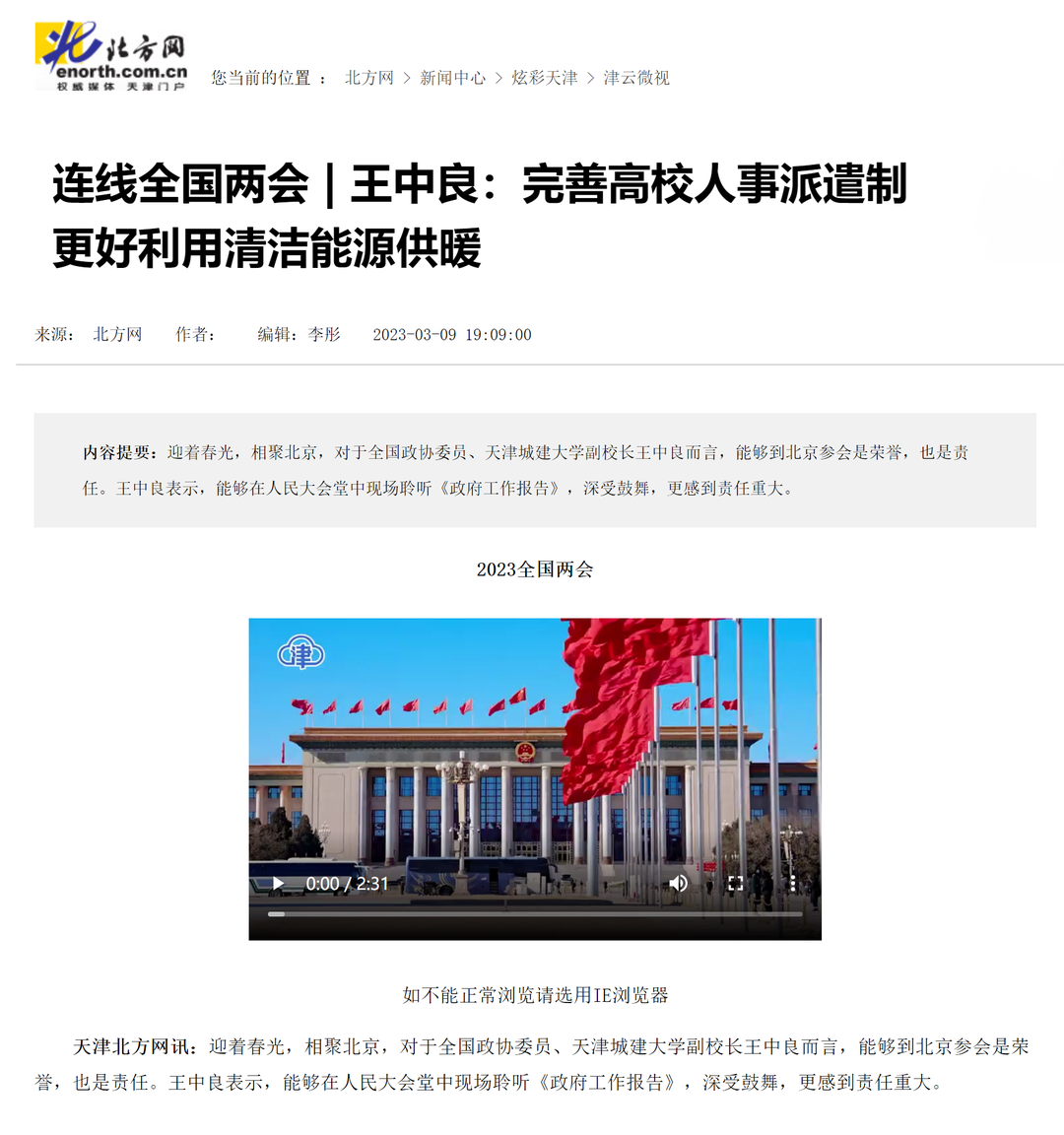 中国人民政治协商会议第十四届全国委员会第一次会议、第十四届全国人民代表大会第一次会议分别于3月4日、5日在北京人民大会堂开幕。连日来,全国政协委员、365英国副校长王中良认真履行神圣职责,积极建言献策,围绕“完善高校人事派遣制”、“ 更好利用清洁能源供暖”等提案,在全国两会上发出365英国声音。3月9日,《天津日报》、津云客户端、北方网等多家媒体对王中良的提案进行相关报道,现将部分媒体报道汇总如下: