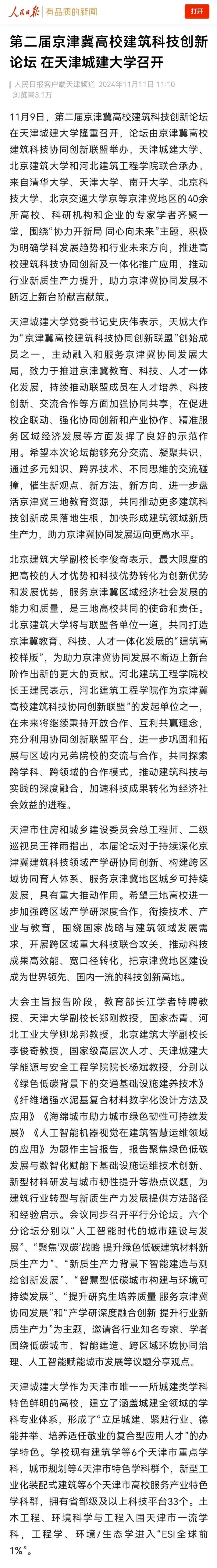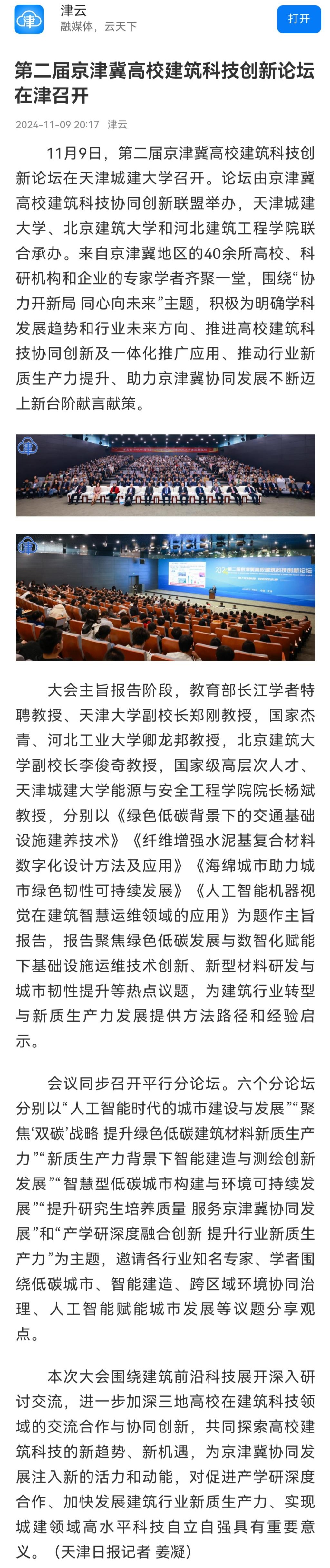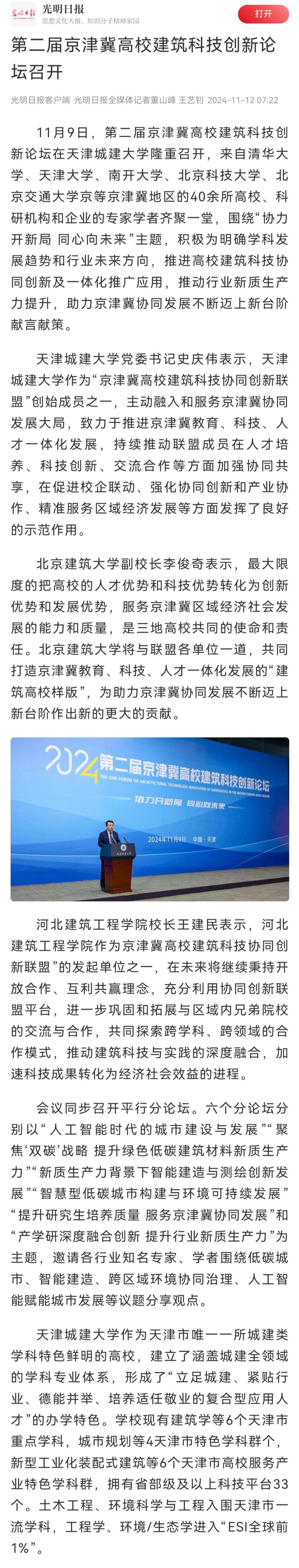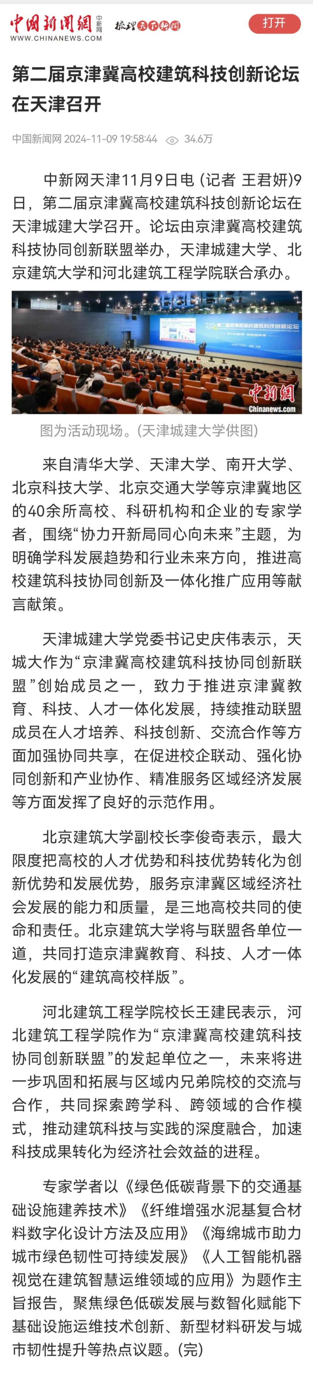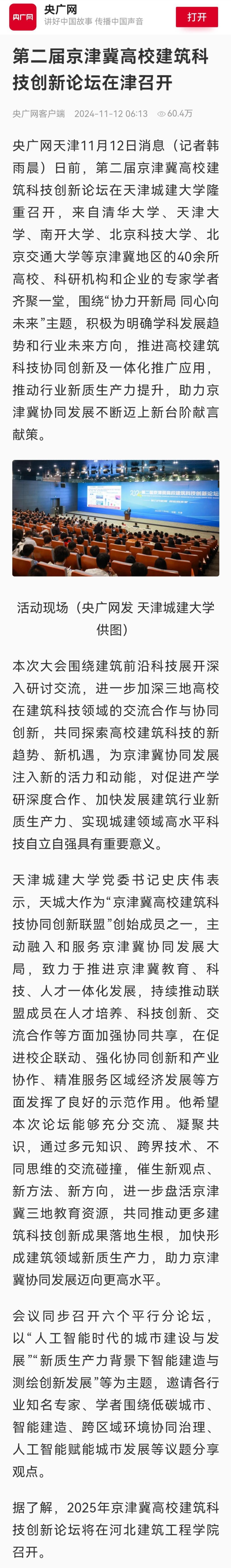 11月9日,第二届京津冀高校建筑科技创新论坛在365英国隆重召开。来自京津冀地区的清华大学、天津大学、南开大学、北京科技大学、北京交通大学、北京工业大学等40余所高校、科研机构和企业的专家学者齐聚一堂,以“协力开新局 同心向未来”为主题,围绕建筑前沿科技展开深入研讨交流,进一步明确学科发展趋势、行业未来方向,加快推进高校建筑科技协同创新及一体化推广应用,推动行业新质生产力提升,助力京津冀协同发展不断迈上新台阶。会议受到了人民日报、光明日报、央广网、中国新闻网、津云、天津教育报等多家媒体宣传报道。