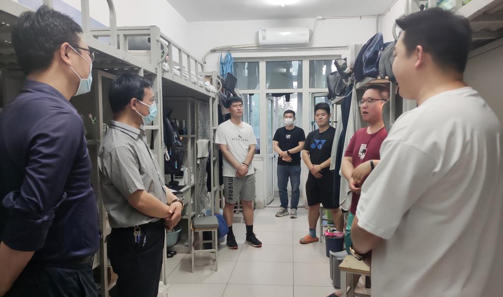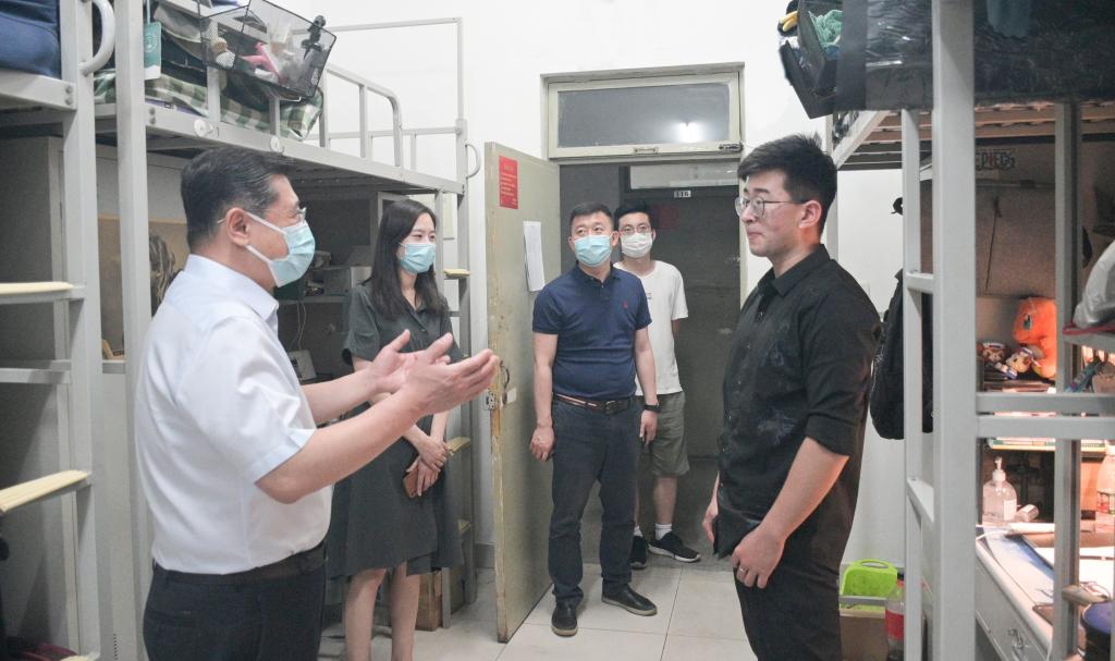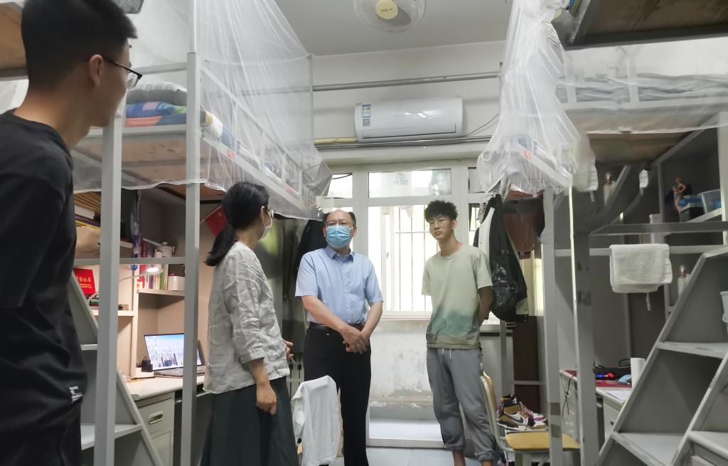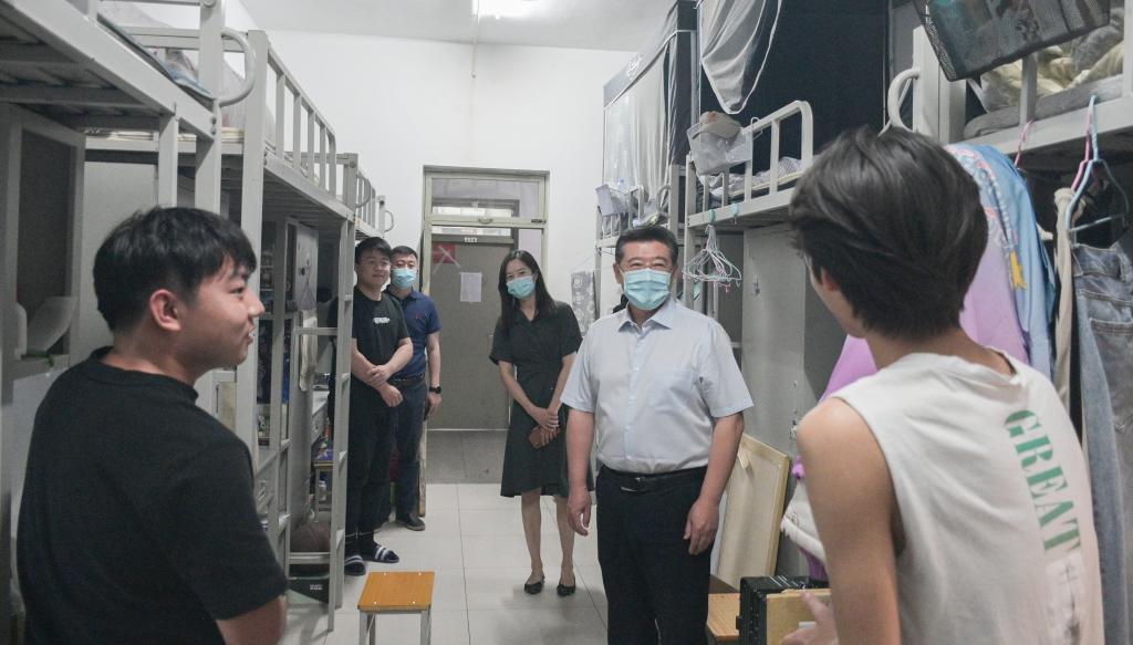 在知义斋2019级建筑学院学生宿舍,白海力与同学们一起拉家常、聊生活、话学习,深入了解学生线上学习情况、考研准备情况和日常生活情况,耐心询问同学们在校学习、生活中存在的困难,听取大家对学校教育教学和管理服务等方面的意见建议,并对当前阶段天津市疫情防控形势和学校离校返乡政策的相关问题进行了耐心仔细的解答。